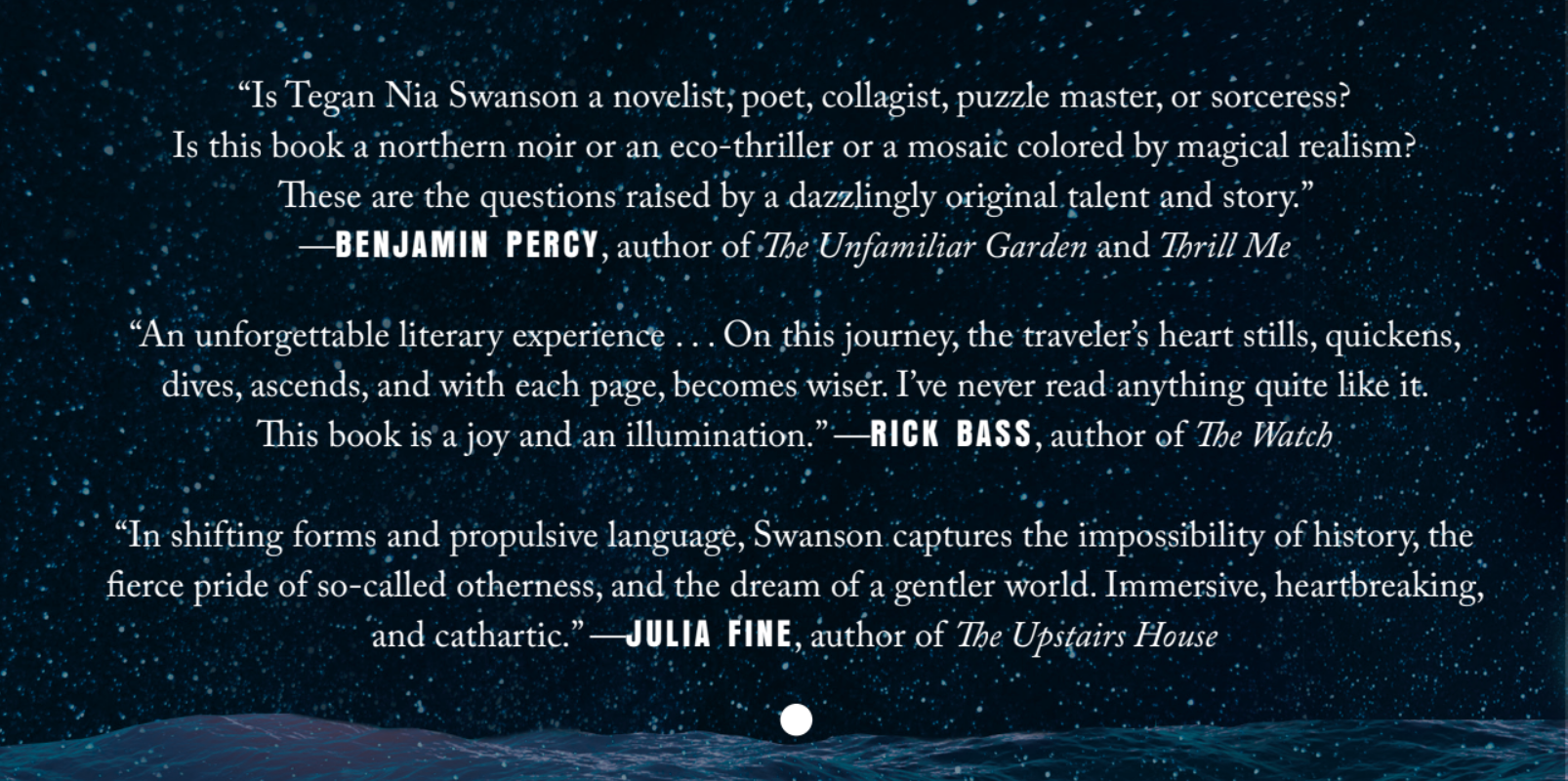 With the inspiration of passion and heightened attention (which some define as prayer) to her characters and setting, Tegan Nia Swanson has written something entirely original and utterly fearless. — Rick Bass, author of The Watch, The Hermit’s Story, and All the Land That Holds Us